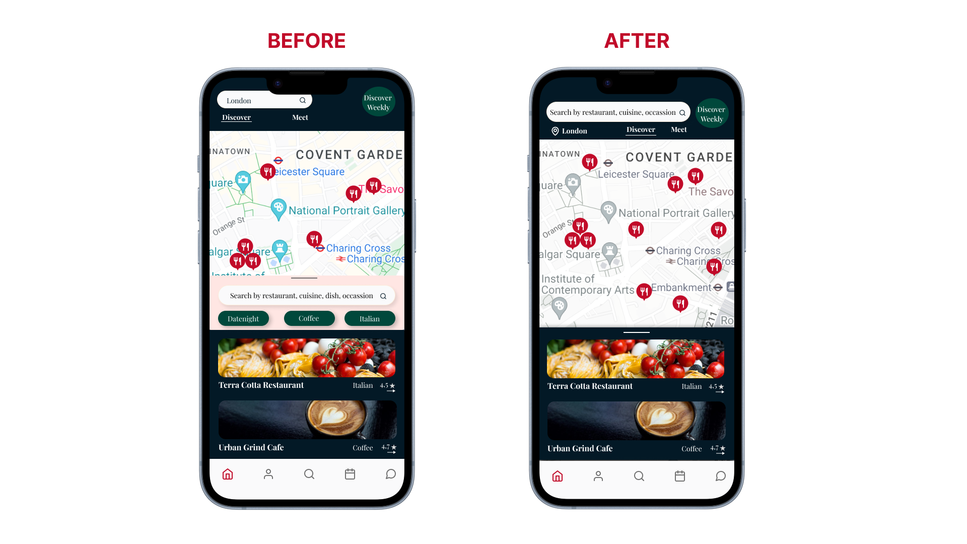 These design alterations aimed to enhance the user experience by decluttering the home screen and making navigation more intuitive. By simplifying the interface, I tried to allow users to focus more on their primary tasks, such as searching for restaurants and exploring recommendations, without unnecessary distractions. These changes collectively contributed to a cleaner, more user-friendly, and visually appealing application.